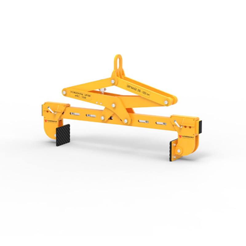 For lifting and moving of concrete blocks and natural stone. Suitable for use on cranes or forklift booms. Clamp jaws are gravity controlled.
